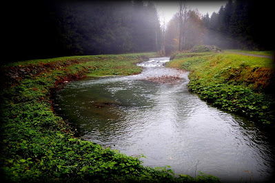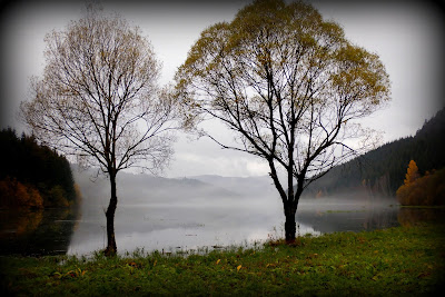 Nežli však vyrazím do protějších kopců, jsem nucen se uchýlit k malému prohřešku. Jinak bych totiž nezahlédl něco z půvabu závěrečné části zmíněné vodní plochy. Ve vhodném místě opustím žlutě značenou turistickou trasu a uchýlím se do hnědozeleného zasmušilého lesa. Připadám si jako antisocialistický narušitel šumavské státní hranice, dychtící po překonání Železné opony. Ten kradmý pohled na snivě zamlženou hladinu však stojí za to! Nezapomenutelný dojem ještě umocňuje tajemně podmračené nebe a až mrazivé okolní ticho. Nenápadně vklouznu zpátky do houštin a konečně mířím ke zmíněným kopcům.